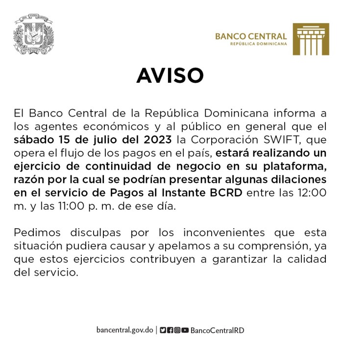 Economía.- El Banco Central está informando que, el sábado 15 de julio, la Corporación Swift, que se encarga de los flujos de pagos en el país, va a realizar un ejercicio de continuidad de negocio en su plataforma, y por eso podrían presentarse algunas dilaciones o inconvenientes en el servicio de pagos al instante BCRD entre las 12 meridiano y las 11 de la noche de ese día.