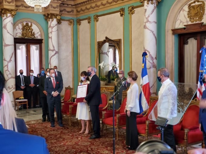 Santo Domingo, RD. El presidente Luis Abinader condecoró este martes con la orden al mérito de Duarte, Sánchez y Mella, a la embajadora de Estados Unidos, Robin Bernstein, por su labor diplomática en República Dominicana.