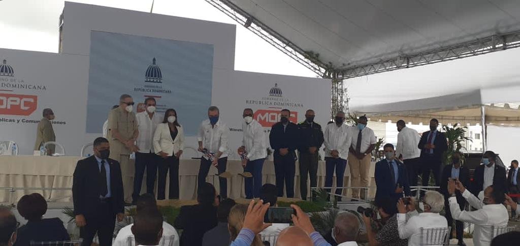 El presidente Luis Abinader, en compañía del ministro de Obras Públicas y Comunicaciones, ingeniero Deligne Ascención, encabezó el acto de inicio de los trabajos para la ampliación de la avenida Ecológica hasta el Puerto Multimodal Caucedo, en la avenida Las Américas, con una inversión superior a los RD$3,120 millones.