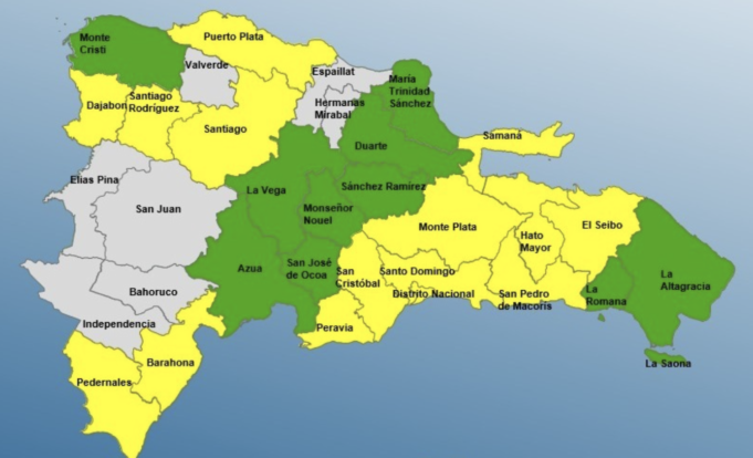 En tanto que en verde se mantienen: Montecristi, Monseñor Nouel, San José de Ocoa, La Altagracia, Azua, La Romana, La Vega, Duarte, Sánchez Ramírez, María Trinidad Sánchez.