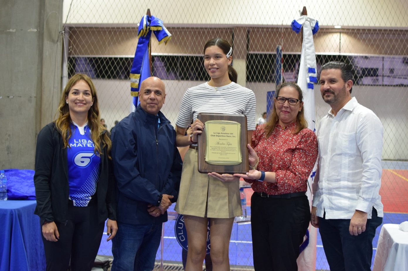 La Liga entregó un reconocimiento al Director de Deportes del club Naco, Manuel Díaz Coronado, por su entrega y dedicación en favor del deporte naqueño. También se reconocieron varias atletas en diferentes renglones.
