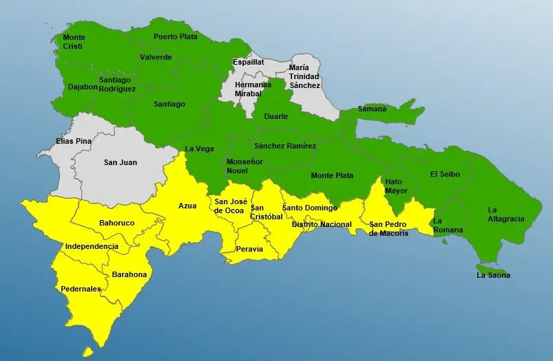 Por su parte, en alerta verde se encuentran La Romana, El Seibo, Sánchez Ramírez, Monte Plata, Duarte, Santiago Rodríguez, Santiago, Dajabón, La Altagracia, Hato Mayor, Samaná, La Vega, Monseñor Nouel, Montecristi, Puerto Plata y Valverde.