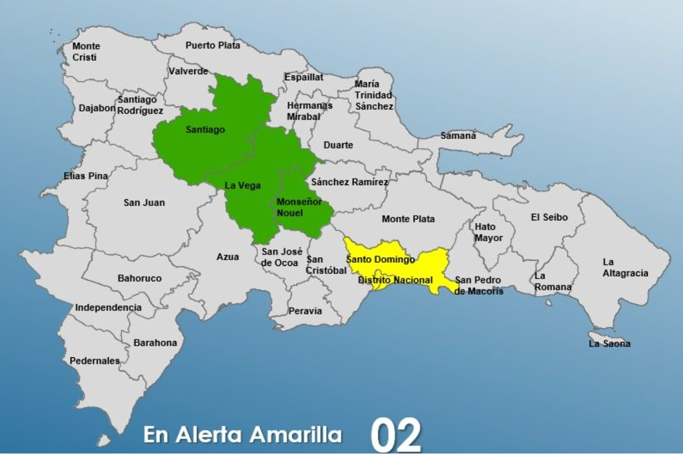 Las provincias en alerta amarilla son Santo Domingo y el Distrito Nacional. Mientras que en alerta verde está Monseñor Nouel, La Vega y Santiago.