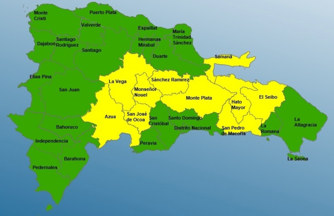 Las provincias en alerta amarilla son: Monseñor Nouel, Sànchez Ramírez, El Seibo, Monte Plata, Hato Mayor, San Pedro de Macorís, La Vega, San José de Ocoa, Azua y Samaná.