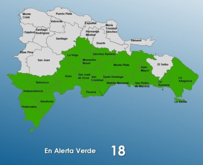 Las provincias en alerta verde son: Peravia, Distrito Nacional, Santo Domingo, Sánchez Ramírez, San Pedro de Macorís, Independencia, La Vega, Monseñor Nouel, San José de Ocoa, Monte Plata, San Cristóbal, Azua, La Altagracia, La Romana, Bahoruco, Barahona, Pedernales y Hato Mayor.