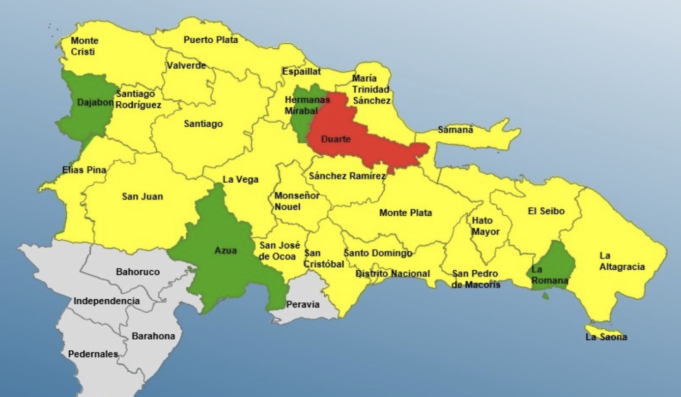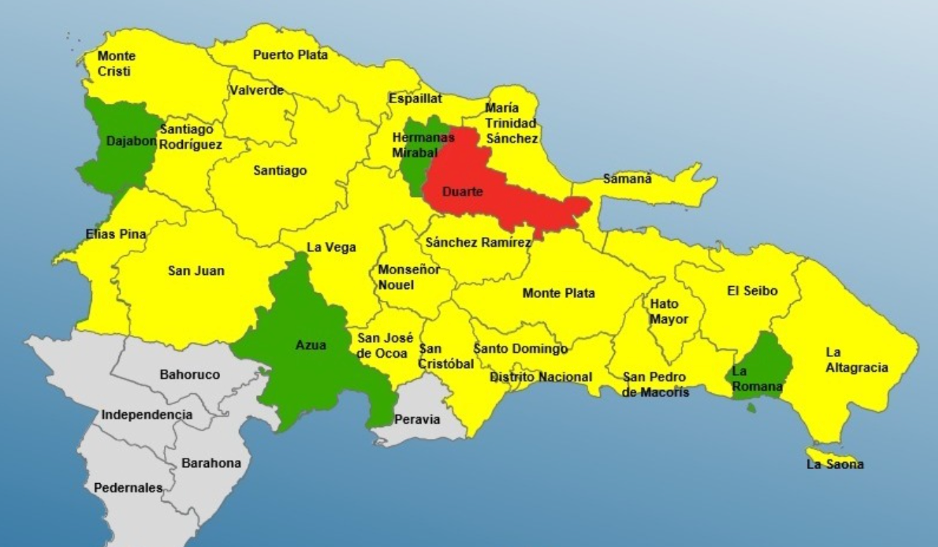 Mientras que en alerta amarilla están: María Trinidad Sánchez, La Altagracia, Monseñor Nouel, San Pedro de Macorís, Santo Domingo, Puerto Plata, San José de Ocoa, Sánchez Ramírez, Santiago Rodríguez, Montecristi, Distrito Nacional, La Vega, Espaillat, El Seibo, Santiago, Samaná, Monte Plata, Hato Mayor, San Juan, Valverde, Elías Piña y San Cristóbal.