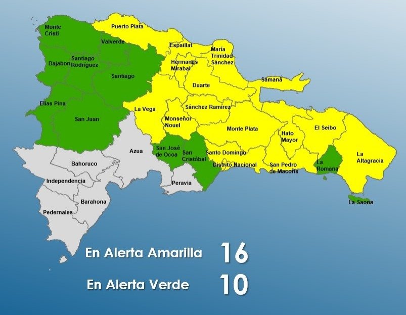 Las provincias en alerta amarilla son: Santo Domingo, Distrito Nacional, Sánchez Ramírez, María Trinidad Sánchez, La Vega, Hermanas Mirabal, Monseñor Nouel, San Pedro de Macorís, Monte Plata, Hato Mayor, Samaná, Duarte, Espaillat, El Seibo, Puerto Plata y La Altagracia.