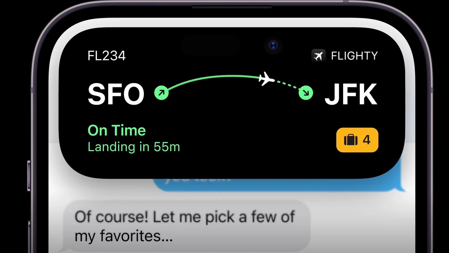 Dentro de la selección de actividades que se podrá visualizar en esta sección y que también puede aprovechar el espacio disponible en la isla dinámica, está la de Flighty. Esta aplicación, diseñada para mostrar información sobre el estado de un vuelo, podrá utilizarse incluso cuando el usuario se encuentra en el aire y con el modo avión activo.