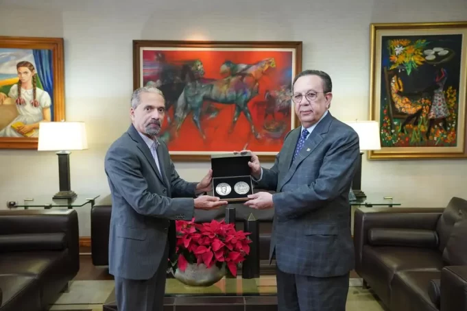 Héctor Valdez Albizu recibió de manos de Uribe, la imagen del Escudo Nacional, y la emisión especial de la medalla conmemorativa del cacique Enriquillo, símbolo del imaginario colectivo de la dominicanidad, rescatado por el decreto 783-01 del presidente Luis Abinader.
