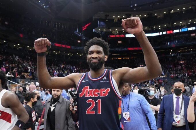 TORONTO, CANADA - APRIL 28: Joel Embiid #21 of the Philadelphia 76ers celebrates after Round 1 Game 5 of the 2022 NBA Playoffs against the Toronto Raptors on April 28, 2022 at the Scotiabank Arena in Toronto, Ontario, Canada. NOTE TO USER: User expressly acknowledges and agrees that, by downloading and or using this Photograph, user is consenting to the terms and conditions of the Getty Images License Agreement. Mandatory Copyright Notice: Copyright 2022 NBAE Mark Blinch/NBAE via Getty Images/AFP (Photo by MARK BLINCH / NBAE / Getty Images / Getty Images via AFP)