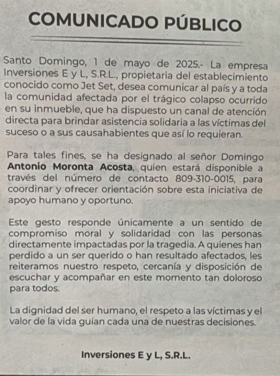 Santo Domingo.- La empresa Inversiones E y L, S.R.L., propietaria del establecimiento Jet Set, emitió este jueves un comunicado público en el que informa sobre la apertura de un canal de atención directa para brindar apoyo a las víctimas del reciente colapso ocurrido en sus instalaciones.