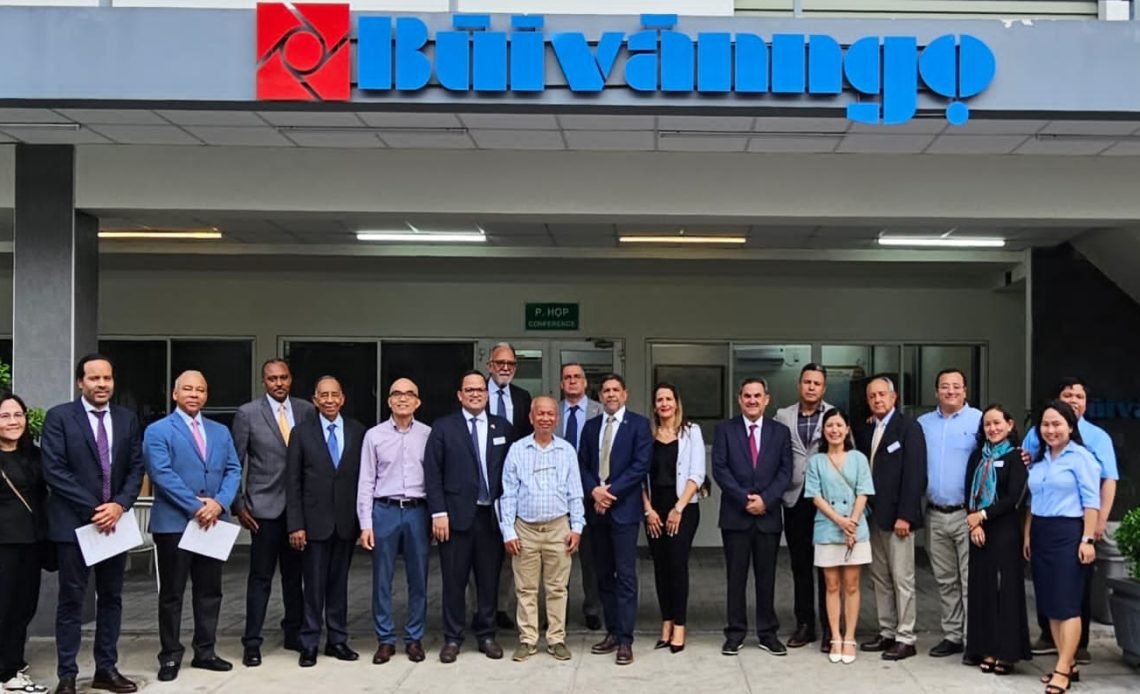 Le acompañan el embajador dominicano en Vietnam, Jaime Francisco Rodríguez; el viceministro de Desarrollo Tecnológico de Agricultura, Rafael Ortíz Quezada, varios auxiliares de la embajada dominicana y una delegación vietnamita.