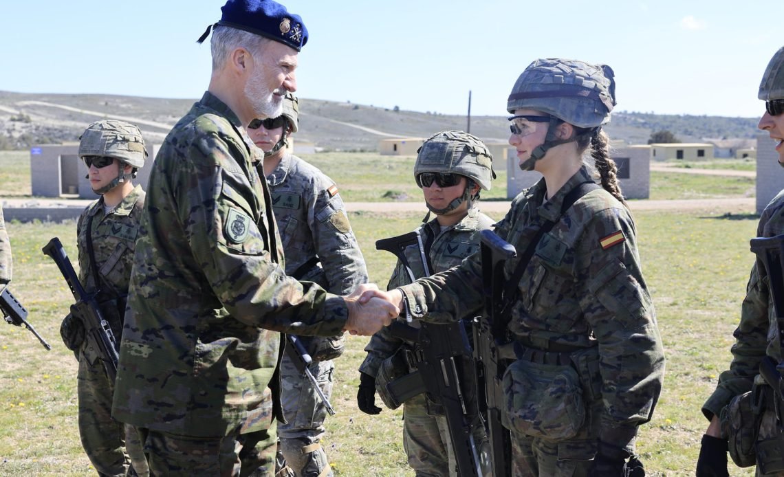 Santo Domingo.- La casa real española distribuyó este lunes varias fotos de la visita que Felipe VI hizo a la Academia General Militar de Zaragoza para seguir las maniobras y ejercicios de combate en que participó la princesa Leonor con compañeros cadetes.