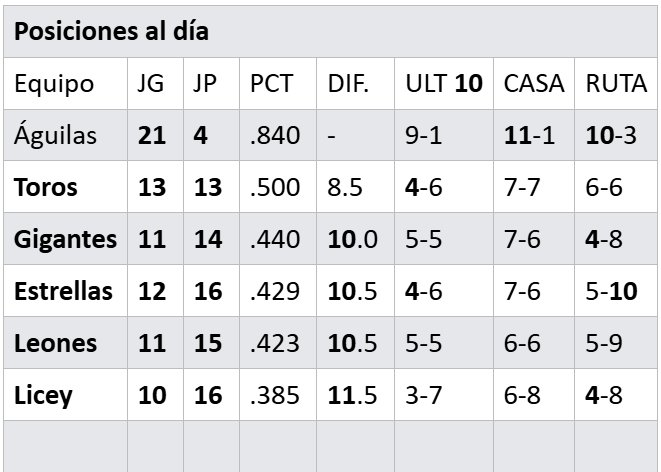 El 27 de octubre de 2025 las Águilas se pusieron con marca de 4-1 (.800) y desplazaron a las Estrellas Orientales (4-2) del primer lugar y desde entonces mantienen la supremacía del torneo.