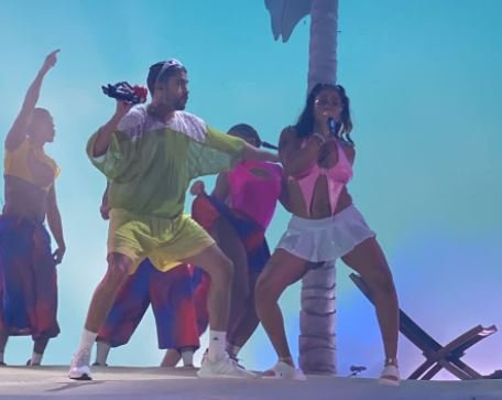 “El conejo malo” animó a “La irreverente” con un afectuoso abrazo y beso para que esta subiera al escenario, convertido en una hermosa playa tropical, y se desplazara por la arena hasta llegar al mismo centro donde se arrodilló ante un eufórico público que de inmediato hizo rugir al estadio.