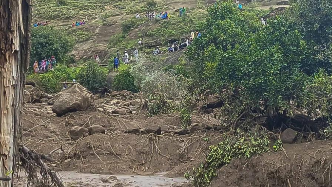 Imágenes publicadas el miércoles por el MLS muestran a una pequeña multitud trabajando en el lugar del deslizamiento que sepultó el pueblo bajo una gruesa capa de lodo, árboles arrancados y vigas rotas.