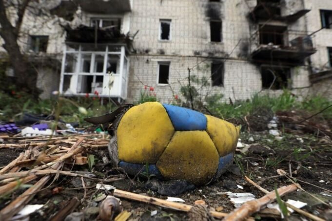 April 22, 2023, Izium, Kharkiv Region, Ukraine: A deflated blue and yellow ball lies on the ground outside a block of flats destroyed in Russian shelling, Izium, Kharkiv Region, northeastern Ukraine. 22/04/2023